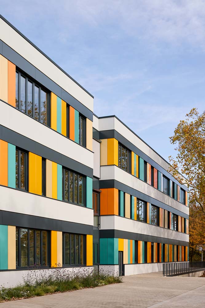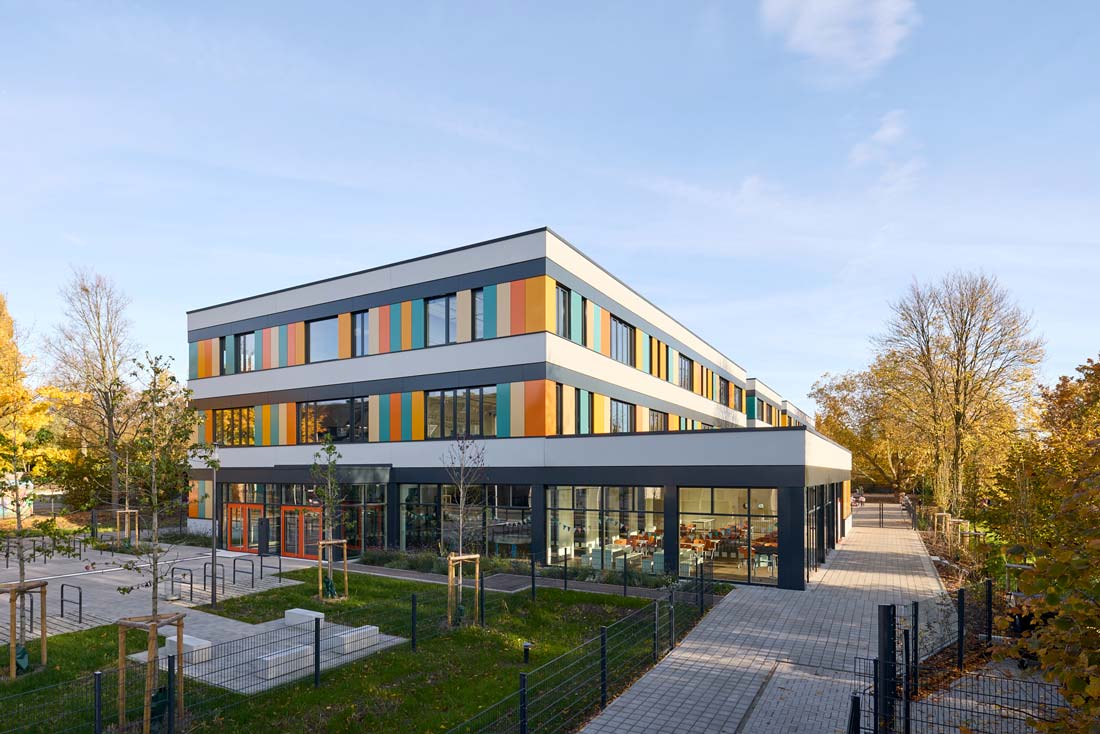 Die geplante Grundschule wurde östlich der in Nord-Süd-Richtung verlaufenden Frankampstraße errichtet. Die Gebäudekubatur passt sich dem Grundstückszuschnitt an, um den grünen Charakter des Plangebietes beizubehalten. Die Bauweise in Betonfertigteilelementen - mit einer außen sichtbaren Weißbetonfassade in durchlaufenden Brüstungselementen und einer bunt gestalteten Paneelverkleidung im Bereich der Fensterebenen - bestimmen den freundlichen Baukörper.