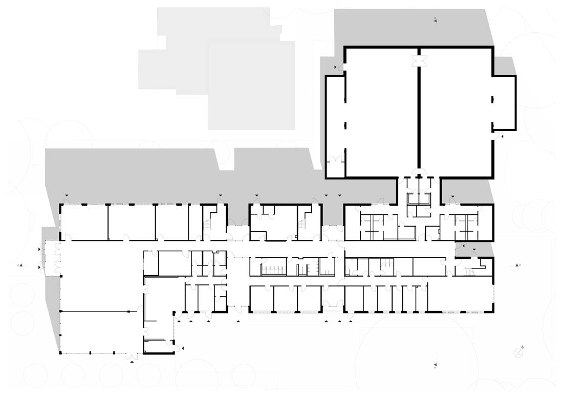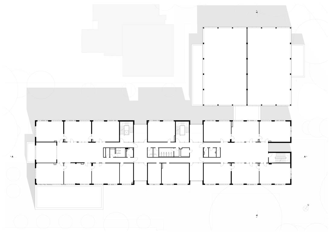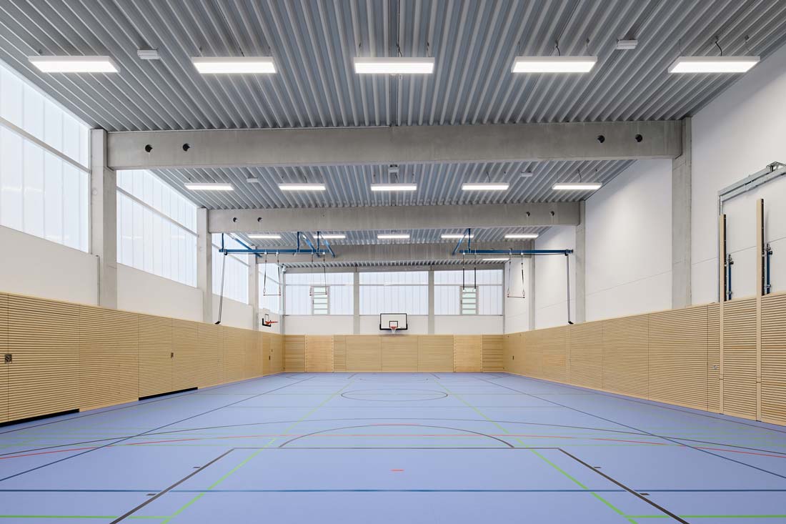Angegliedert an den Schulbau werden zwei quer aneinander gereihte Sporthallen geplant, welche durch ein umlaufendes Lichtband großzügig und blendfrei belichtet werden.