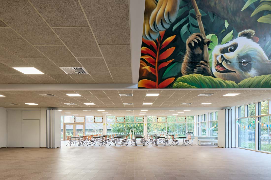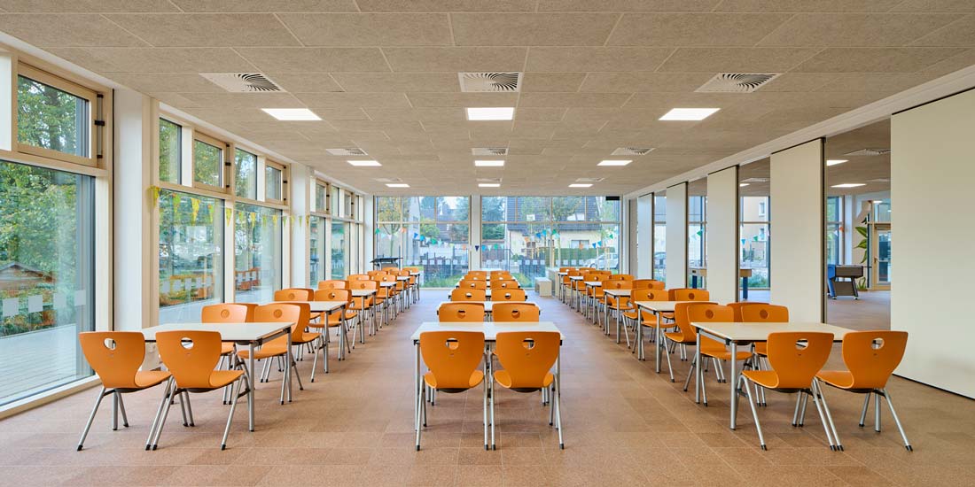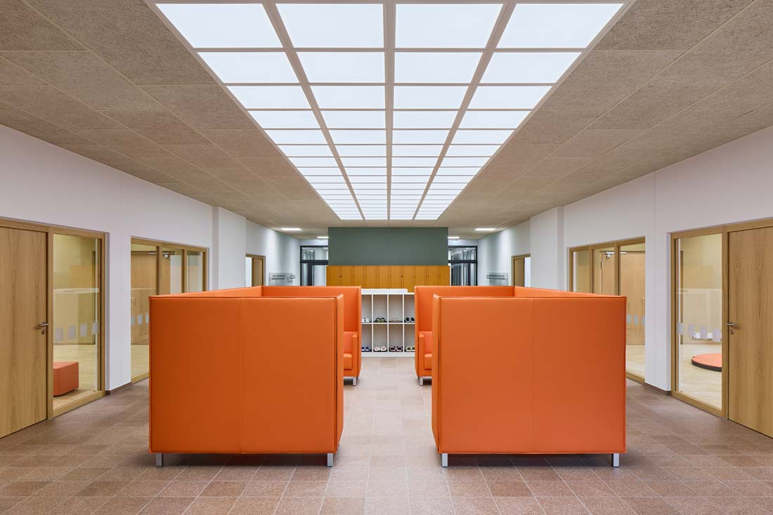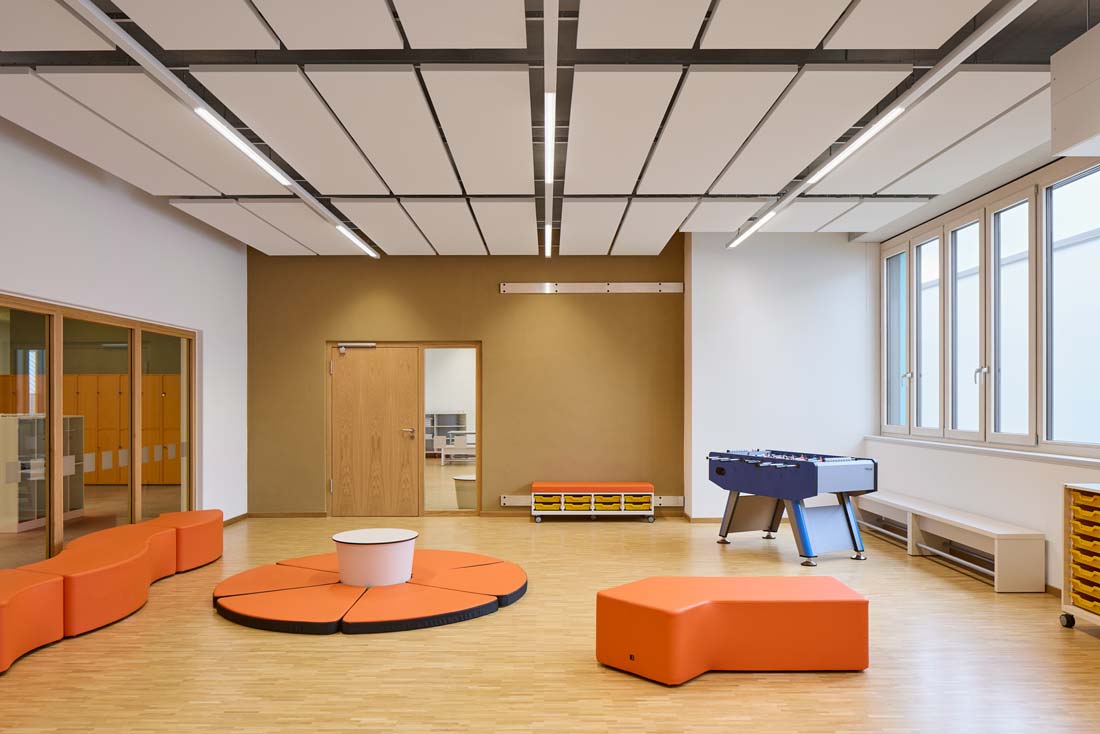 Alle Unterrichtsräume wurden mit dezentralen Lüftungsanlagen geplant. Das Gebäude verfügt über eine großzügige Photovoltaikanlage auf dem Dach und Fußbodenheizung in allen Räumen. Als Energieträger wurde eine Luft-Wasserwärmepumpe gewählt.