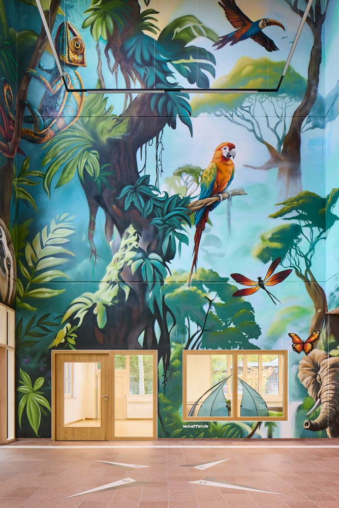 Erschlossen wird das Gebäude aus Richtung der Frankampstraße über ein großzügiges Foyer mit dreigeschossigem Luftraum, dessen Wände von den Graffitikünstlern „Lackaffen“ gestaltet wurden. Die nur über eine Faltwand getrennte Mensa gliedert sich direkt an das Foyer an, unterstützt die großzügige Wirkung des Eingangsbereichs und kann separat, aber auch in Kombination mit dem Foyer genutzt werden. Ergänzend werden im Erdgeschoss eine Bibliothek, Nebenräume und der Verwaltungstrakt verortet.