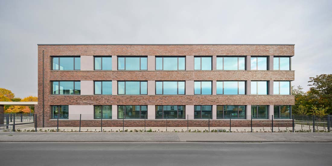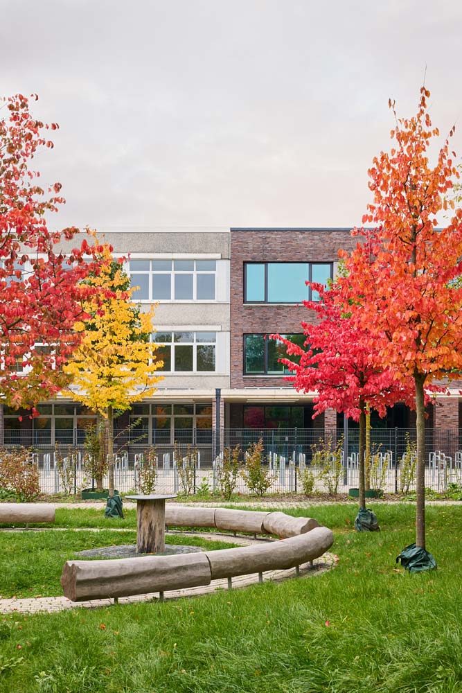 Die neu entstandenen Gebäude ergänzen die vorhandenen Häuser zu einem Gesamtensemble. Es wurden zwei Anbauten an die jeweiligen Schulen und ein gemeinsames freistehendes Mensagebäude, das durch die Einführung des Ganztags an beiden Schulen erforderlich wurde, ausgeführt.