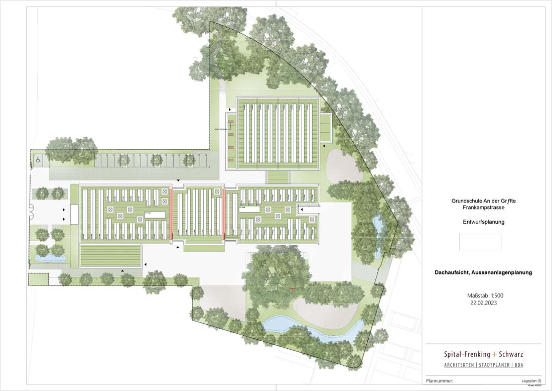 Die geplante Grundschule wird östlich der in Nord-Süd-Richtung verlaufenden Frankampstraße errichtet. Die Gebäudekubatur passt sich dem Grundstückszuschnitt an und versucht möglichst viel des vorhandenen Baumbestands zu erhalten, um den grünen Charakter des Plangebietes beizubehalten.