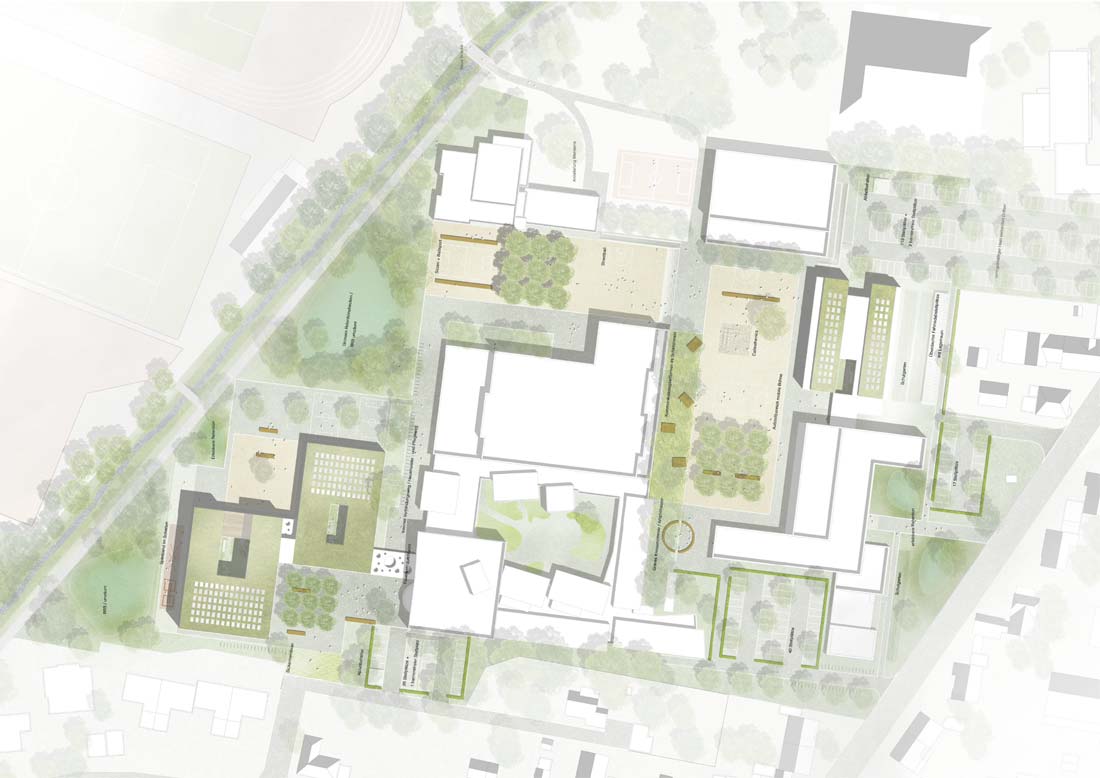 Auch die Freianlagen werden zu einem differenzierten Lern- und Bewegungsraum entwickelt. Neue Schulhöfe, Sport- und Aufenthaltsbereiche sowie ein „Grünes Klassenzimmer“ schaffen vielfältige Möglichkeiten für Unterricht und Freizeit. Regenwasserrückhaltung wird als gestaltetes Landschaftselement in den Campus integriert.