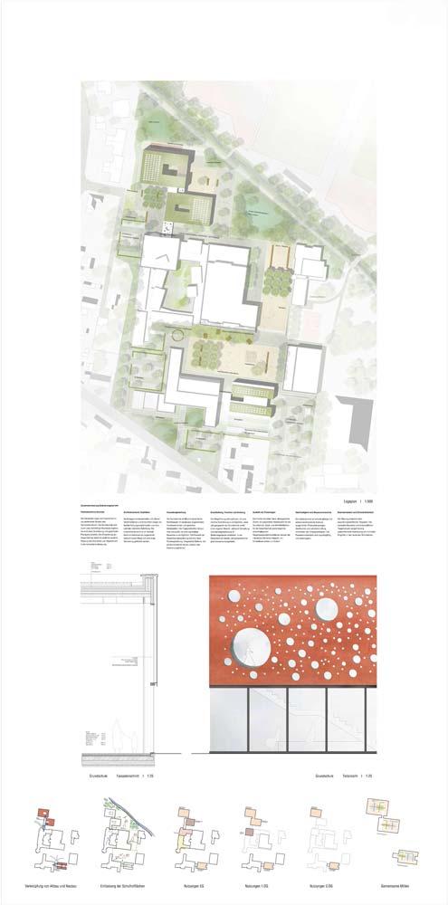Der Entwurf versteht das Schulzentrum als zusammenhängenden Bildungscampus. Neue Baukörper ergänzen die bestehenden Gebäude und greifen deren Fluchten und Maßstäbe auf. Durch ihre präzise Setzung entstehen klar gefasste Schulhöfe, neue Platzsituationen und eine intuitive Orientierung auf dem Gelände.