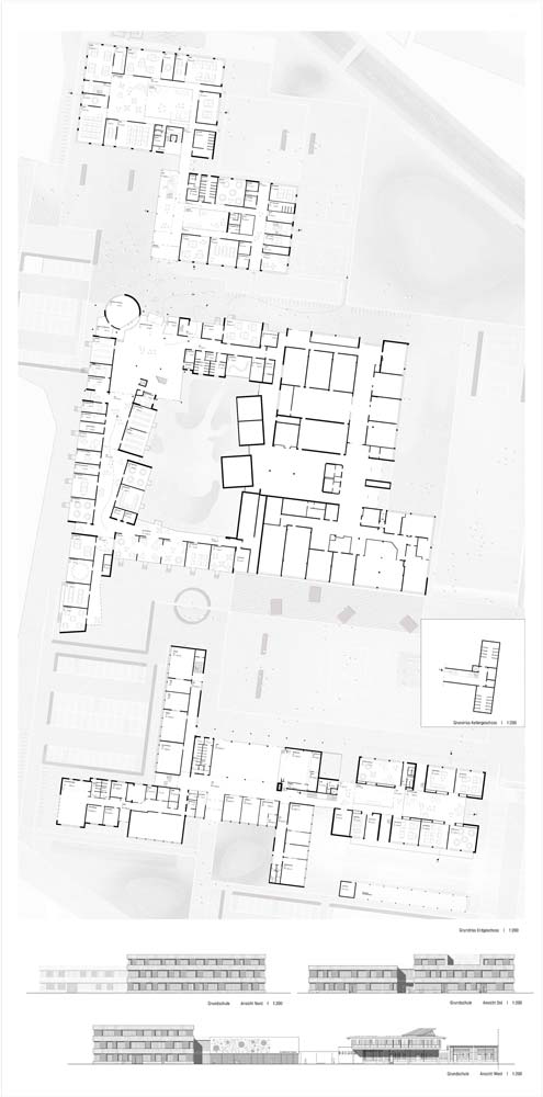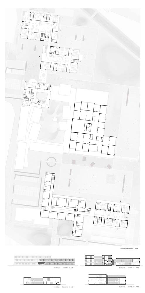 Die Erweiterung der Gesamtschule ergänzt die südliche Raumkante des Schulhofs und verbindet Alt- und Neubau über einen gemeinsamen Eingangsbereich. Die Grundschule wird durch zwei Neubauten erweitert, die über ein großzügiges Vordach miteinander verbunden sind und einen geschützten Übergang zwischen den Gebäuden schaffen. Gleichzeitig entsteht ein einladender Vorplatz als neuer Auftakt des Schulstandorts.